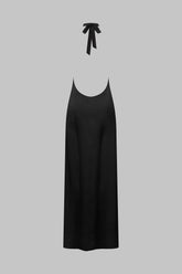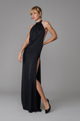 This backless dress stands out for its long, straight cut, which hugs the body and creates a sleek, assertive silhouette. It is made from double-sided opaque satin for softness, a flowing style and incomparable quality. A deep backless cut and a design that opens all the way up to the top of the leg is sure to turn heads. The pleated American neckline fastens with a double-sided satin ribbon that you can tie at the neck to suit you.