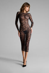 This long-sleeved midi dress features mostly recycled openwork lace. Fitted style with flat elasticated trim. The midi length accentuates your curves for a confident '80s style.