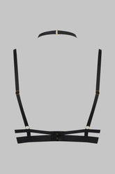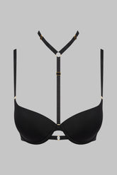 The TAPAGE NOCTURNE push-up bra is crafted from matte, opaque black microfiber. Designed to sculpt a striking neckline, it features foam cups with removable pads that enhance the curve, while an underwire beneath the bust ensures precise support. At the center of the chest, a removable and adjustable harness rises to the neckline, tracing a graphic line like a piece of lingerie jewelry. At the back, a double open elasticated band highlights the silhouette and subtly reveals the skin, completed by adjustable straps and a customizable hook fastening.