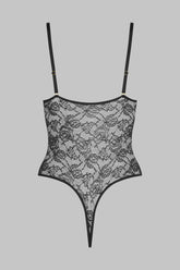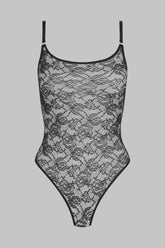 This thong bodysuit with straps features mostly recycled openwork lace. With its flat elasticated trim, the high-leg design emphasises the hips for an '80s style. Adjustable hook-and-eye fastening at the crotch. Removable, adjustable Signature straps with gold trim – interchangeable with the other Signature straps available in a range of colours. An opportunity for each Muse to create their own unique mix and match.
