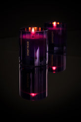 Lacquered, screen-printed faceted glass that gives the candle flame a unique colour as it gradually burns down.