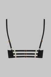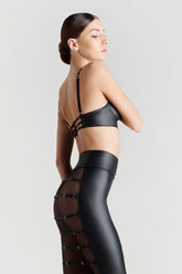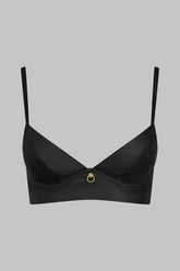 Leather effect wireless bra. Bustier cut with triangle cups, lined on the front for a seamless appearance. Slip-on garment, elasticated adjustable straps with golden ornamental trims. Elasticated adjustable straps at the back. The collection's signature "feti-chic" ring embellishes the décolleté, inviting you to attach it.