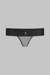 Tanga briefs with provocative leather effect fabric on the waist and sheer tulle on the crotch and buttocks. The collection's signature golden "feti-chic" ring embellishes the front, inviting you to attach it.