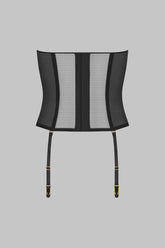 The L’AMOUREUSE bustier garter corset, in tulle of absolute transparency, is structured with soft vertical boning at the front and back. A transverse seam design extends into adjustable, removable garters. The sides, doubled and seamless, smooth the silhouette. Smooth, delicate back hook closure.