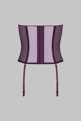 Garter belt corset in 100% sheer mesh. Structured corset with flexible vertical boning in the front and back. Transverse seams extended into adjustable and removable garters. Seamless lined sides for an enhanced silhouette.