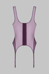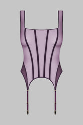 Corset top with suspenders in 100% sheer mesh. Vintage style corset with straight neckline and transverse seams structured by flexible vertical boning. Lined tulle on the sides to enhance the hips, extended with adjustable and removable garters. Sleek and subtle hook and loop back closure.