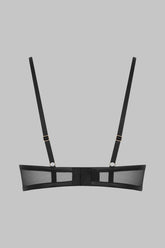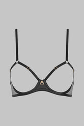 Leather effect and mesh tulle underwired cupless bra. Elasticated adjustable décolleté with golden ornament trims. Elasticated adjustable straps at the back. The collection's signature "feti-chic" ring embellishes the décolleté, inviting you to attach it.