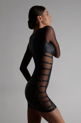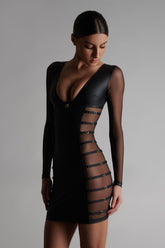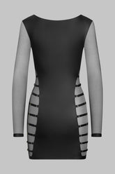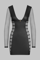 Matte leather effect and sheer tulle long-sleeved dress . Plunging neckline and fitted cut to enhance the figure. Transparent tulle harnessed with adjustable elasticated straps on the back. The collection's signature golden "feti-chic" ring embellishes the front, inviting you to attach it.