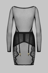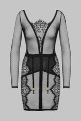 Long-sleeved short dress adorned with a gold cross to team Gothic lace with Swiss dot stretch mesh. Elasticated picot trim details structure the silhouette. Trimmed with 4 suspender straps with adjustable, detachable extenders with gold crosses. This body-con dress turns into a haunting ready-to-wear garment that can be worn day and night.