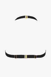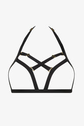 The Open Triangle Bikini Top Fatale redefines swimwear codes with an ultra-graphic design. Made of microfiber-covered elastics, it frames an open triangle for a sensual look, perfect worn alone or layered over another piece. The straps are adjustable at the neck and back, adorned with delicate gold-toned metal accents. The top fastens with two gold clasps. The neckline is framed by uncovered elastics, fully adjustable and removable, to be styled straight, crossed, or not at all – offering a masterfully controlled bondage effect. Free from underwires, this bikini top remains comfortable with covered elastics under the bust and around the back.