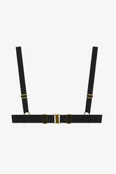 The Underwired balconette bikini top Fatale combines comfort and support with a structured, elegant silhouette. The lightly padded cups are cloaked in soft microfiber and highlighted by a wide exposed elastic band tracing the neckline. This swimsuit features a subtle underwire with a "mono" effect for refined support. Bust darts ensure a naturally tailored fit. The wide, microfiber-covered straps extend directly from the underwires and are adjustable with gold-toned metal accents. The back is adjustable and reinforced with a wide covered elastic band for enhanced comfort.