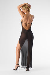 The Fever backless maxi dress is crafted from fluid, semi-sheer black viscose crepe, offering a light and elegant silhouette. Its slightly fitted cut naturally follows the contours of the body, while a slit on the left side subtly reveals the leg. The open back is framed by fine adjustable ties adorned with Maison Close’s signature black “lipstick” tips—an exquisite, refined detail. Thanks to their sliding design, the ties allow for adjustment of both the neckline depth and dress length, ensuring a perfect drape.