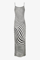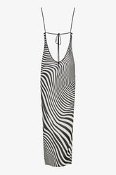 The Fever backless maxi dress is crafted from fluid, semi-sheer viscose crepe adorned with a psychedelic print, offering a light and elegant silhouette. Its slightly fitted cut naturally follows the curves of the body, while a slit on the left side subtly reveals the leg. The open back is structured with fine adjustable ties, finished with Maison Close’s signature black “lipstick” tips—an exquisite and distinctive detail. With their sliding system, the ties allow you to adjust both the neckline depth and the dress length for a flawless drape.