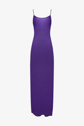 The Fever backless maxi dress is crafted from fluid, semi-sheer viscose crepe in a vibrant electric violet, offering a light and elegant silhouette. Its slightly fitted cut naturally follows the body’s curves, while a slit on the left side subtly reveals the leg. The open back is structured with fine adjustable ties, finished with Maison Close’s signature black “lipstick” tips—an exquisite, refined detail. Thanks to their sliding system, the ties allow you to adjust both the neckline depth and the dress length for a flawless drape.