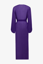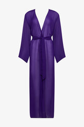 The Fever Kimono is crafted from fluid, semi-sheer viscose crepe in an electrifying shade of violet—perfect for bringing a sense of lightness to any swimwear look. Its long, straight, and flowing cut is structured by a removable black belt with beveled edges, threaded through two side loops. The wide, long sleeves enhance the piece’s airy, voluminous silhouette, ideal for wearing over a swimsuit or as elegant resortwear.
