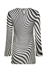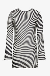 The Fever long-sleeved short dress is crafted from fluid, semi-sheer viscose crepe adorned with a psychedelic print, offering a light and ethereal feel. Its fitted cut gently embraces the silhouette, while the subtly flared long sleeves add graceful movement. The classic round neckline draws attention to the delicate keyhole opening at the back, fastened with a discreet black button engraved with the Maison Close signature.