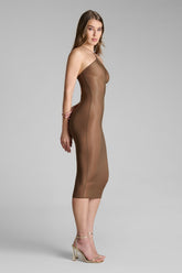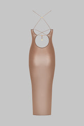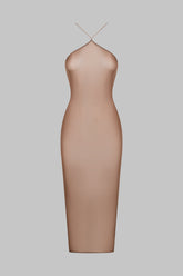 Midi-length dress with semi-halter neckline crafted from a fine jersey with shiny, subtly sheer reflections. The open back is enhanced by a lacing detail, and the halter neck is adjustable thanks to unique sliders and gold lipstick accessories signed by Maison Close.