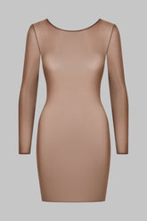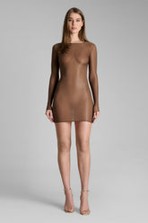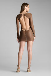 Short long sleeve dress with boat neckline crafted from a fine jersey with shiny, subtly sheer reflections. The front features a minimalist and refined silhouette, while the back is fully revealed down to the small of the back with delicately ruched lacing at the neck. The lacing is adjustable thanks to unique sliders and gold lipstick accessories signed by Maison Close.