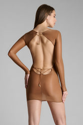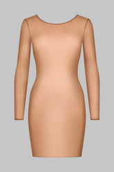 Short long sleeve dress with boat neckline crafted from a fine jersey with shiny, subtly sheer reflections. The front features a minimalist and refined silhouette, while the back is fully revealed down to the small of the back with delicately ruched lacing at the neck. The lacing is adjustable thanks to unique sliders and gold lipstick accessories signed by Maison Close.