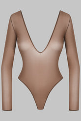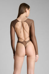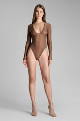 High-cut long sleeve thong bodysuit crafted from a fine jersey with shiny, subtly sheer reflections.