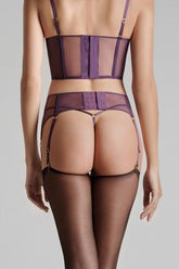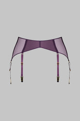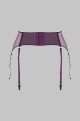 Garter belt in 100% sheer mesh. Arched front with lined mesh for a contrast of transparency and opacity. Six adjustable, non-removable garters outline the thighs. Sleek and subtle hook and loop back closure.