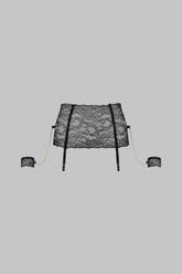Stretch floral lace suspender belt. Jewellery-style handcuffs with fine removable gold chains which can be attached or detached to suit you. Four black and gold suspenders give the garment structure.