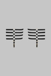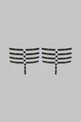 Parure Signature suspenders by Maison Close. A jewellery-accented accessory to subtly accentuate your nudity with clusters of fine gold rings and elastic ribbons. Adjustable for all body shapes.