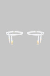 Two white Signature garters stamped with the Maison Close logo. Adjustable elasticated bands with gold accents. Movable mini suspender straps for positioning on either side of the leg once the garter is adjusted.