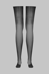 Maison Close’s signature rolled-edge stockings. The black shade elegantly highlights the legs for a unique style. The silky 20-denier voile stands out with its exceptional sheen, to be paired with a garter belt for a perfect fit.