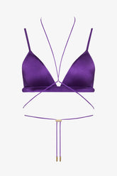 Soft triangle bikini top without underwire, combining silky smoothness and style. Designed to perfectly embrace the shape of the breasts with its seamless molded triangle cups. The halterneck tie is fully removable and adjustable thanks to a unique slider and Maison Close’s signature gold lipstick accessories, enhancing your neckline while allowing for personalized styling. Thin flat adjustable straps ensure a flawless fit. An elastic underband delicately hugs and sculpts the bust. Closes at the back with a jewelry clasp.