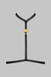 Jewellery detail harness adorned with the Inspiration Divine gold cross. Elasticated picot trim details structure the silhouette like a cupless bra, removable by a golden fastener. Can be worn front-to-back or back-to-front over outfits or lingerie to suit you.