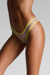 Thong in transparent pastel tulle, outlined with ultra-flat fluorescent elastic. A high-cut 80s-style silhouette that elongates the legs. Maison Close logo in relief at the back. No cotton lining for complete transparency.