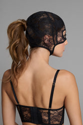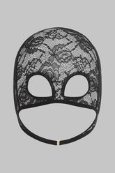 This balaclava features mostly recycled openwork lace. Fitted style and cat eyes with flat elasticated trim. Concealed opening at the back to let hair through. Gold clasp on back.