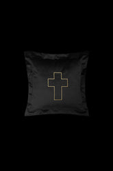 The INSPIRATION DIVINE cross spreads its aura across the fabric. A bordered black velvet cushion, subtly embroidered with golden threads, blending elegance and sacredness.
