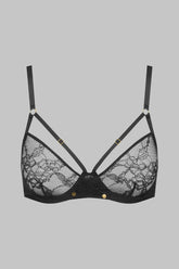 The Balconette Bra JEUX MAGNÉTIQUES draws a direct line between lace and desire. Its underwired shape naturally enhances the bust, while the cross-over neckline, closed by subtle golden magnetic buttons, orchestrates a controlled revelation. Floral lace embraces the curves with finesse. Adjustable elastics at the neckline, adjustable straps, and back fastening ensure a precise fit. Each button becomes a gesture, each opening a thrill. A piece designed for players, those who know when everything must shift.