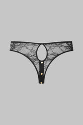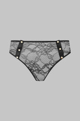 The High-Waist Thong JEUX MAGNÉTIQUES blends retro inspiration with daring functionality. In stretch floral lace, it highlights the waist and refines the silhouette while leaving room for play. At the front, a series of golden magnetic buttons allows a full opening, extending to the back and revealing a delicate teardrop at the small of the back. A design conceived to open with a single gesture and adapt to the moment. To wear alone or paired with other pieces from the collection.