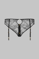 The Suspender Panty JEUX MAGNÉTIQUES reveals a play of lines and textures designed to seduce. Crafted in stretch floral lace, it sits low on the hips and opens at the front with a discreet golden magnetic button. Two teardrop cut-outs, placed at the front and at the small of the back, highlight the silhouette with boldness. The removable and adjustable suspenders are adorned with golden metallic finishes for a look that is both elegant and magnetic. To coordinate as desired with the stockings from the collection.