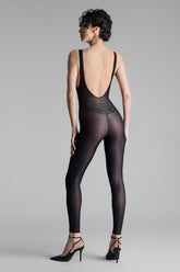 Catsuit with wide straps, crafted from fine jersey with shiny and subtly transparent highlights. Fitted cut edged with ultra-flat, comfortable elastic. Its neckline, high-cut armholes, and daring backless design take us back to the 90s. The Maison Close golden logo signature is displayed at the small of the back.