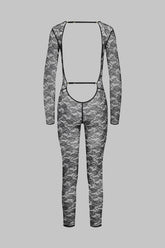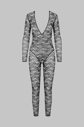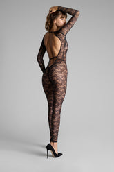 The V-neck, long-sleeved catsuit is embellished with mostly recycled openwork lace. Fitted style with flat elasticated trim. Its plunging backless style takes us back to the '80s. Can be matched with the Maison Close Signature elasticated straps with gold accessories.