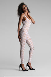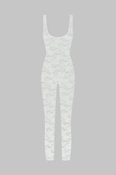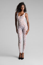 This open-backed catsuit features mostly recycled openwork lace. Fitted style with flat elasticated trim. Its plunging neckline, accentuated armholes and bold backless style take us back to the '80s.