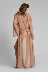 Light as a caress, the Sienne Fever kimono wraps the body in a sheer, airy veil with subtle transparency. Its long, straight cut flows into wide sleeves, creating a fluid and ethereal silhouette. A removable belt, threaded through two side loops, allows for versatile styling—whether worn loose or cinched at the waist.