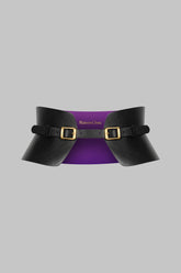 Powerful and sculptural, the L’Étreinte leather corset belt embodies artisanal craftsmanship and structured sensuality. Handmade in Europe, this unique piece combines smooth black lambskin on the outside with goatskin lining on the inside, in an iconic shade of violet. Its adjustable design allows it to be worn at the waist or hips thanks to a leather loop system. Gold buckles and rivets highlight the elegance of this belt, designed to embrace and enhance the body. Its contoured shape sculpts the silhouette with character, adding a bold touch of elegance to any outfit.