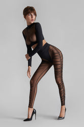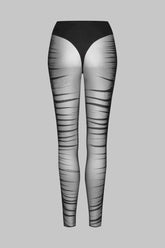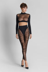 High-waisted, bi-material leggings. The high-cut opaque thong insert at the front and back, accentuated by a wide covered elasticated waistband, elongates the silhouette. Fully sheer tulle structured with side seam pleats sculpts feline-looking legs.