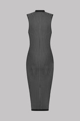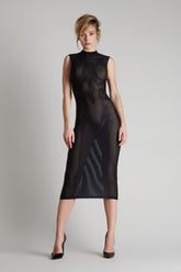 Microfibre midi dress with openwork, transparency and graphic stripes. Collar and armholes bordered with plain black microfibre for a contrasting effect. Very fitted cut that shows off the silhouette.