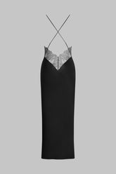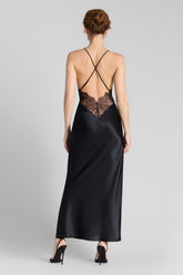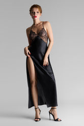 Long dress in silk and eyelash lace. Long flowing ultra-feminine silk garment with slit. V neckline and bare back adorned with rigid lace that delicately hugs the figure. Fine silk adjustable straps with golden accessories cross the back.