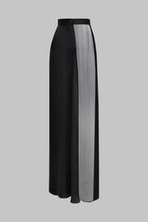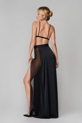 This high-waisted dual-material maxi skirt is made from double-sided, opaque satin for a smooth, flowing effect and incomparable quality. The ultra-sheer, wispy muslin, subtly reveals the entire length of the leg right up to the waist. It fastens at the front with a button placket featuring Maison Close lettering above a bold slit that shows off your legs as you walk. A flat double-sided satin waistband elegantly accentuates the waist.