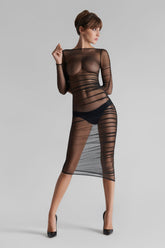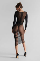 Long sleeves midi dress. A sublime transparency runs along the body from the boat neckline to the bottom to highlight it.