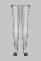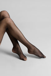 Maison Close's signature cut and curled stockings. The fine fishnet is adorned with silver Lurex® thread. An ultra-shimmering effect while retaining the softness of fishnet. When paired with Maison Close dresses with their plunging necklines, they show off your gleaming legs with a touch of sophistication. Without foot support, opt for heeled sandals. Made in Italy in a workshop known for its excellence.