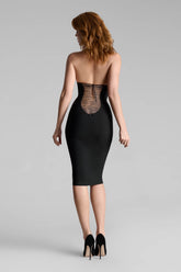 This halter midi dress offers a sleek, fitted silhouette. The open back is adorned with adjustable lacing featuring a regulator for precise adjustment. The halter neckline is equipped with a black metal hook and three adjustment settings. Its midi length makes it an ultra-elegant piece.