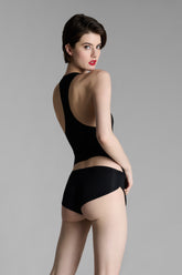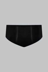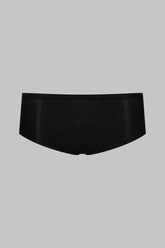 Low-rise mini shorts with a unique feel. Stretchy, ultra-soft, lightweight ribbed modal that stretches and has a sheer, shiny sheen. Elasticated tunnel waistband. This garment has an '80s look with rounded slits on the sides to accentuate the figure.
